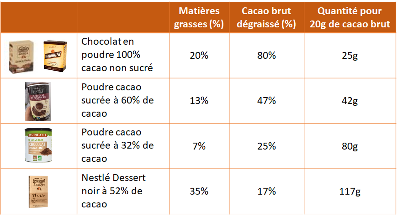 Comme pour le chocolat en tablette, il faut bien lire les étiquettes pour connaitre la quantité de cacao sec contenue dans le cacao en poudre, pur ou non.