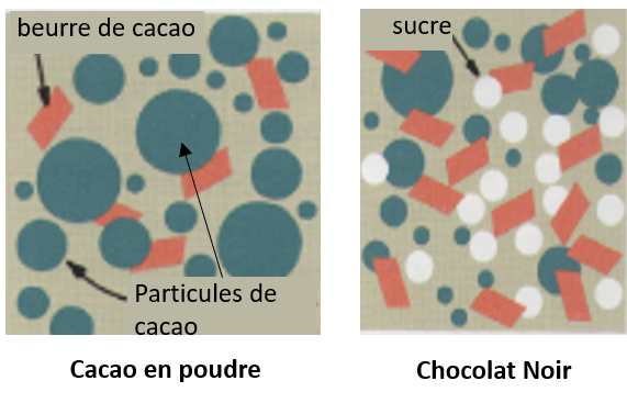 Comme nous l’avons vu dans un précédent article sur la sauce au chocolat, le chocolat noir est un mélange de particules de cacao (cacao sec), de beurre de cacao et de sucre. Pour le chocolat au lait il y a aussi du lait en poudre.