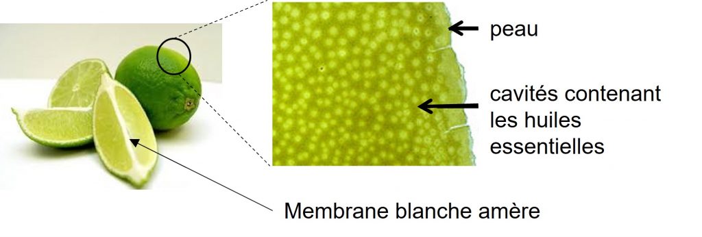 Comme pour tous les agrumes, la peau des citrons verts contient de très nombreuses glandes qui produisent les huiles essentielles responsables du goût citronné. C’est pour cela qu’on zeste les agrumes pour récupérer ces huiles essentielles.