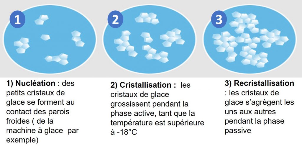 Comme nous l’avons vu dans un article précédent sur les sorbets, la glace se forme en 3 étapes :