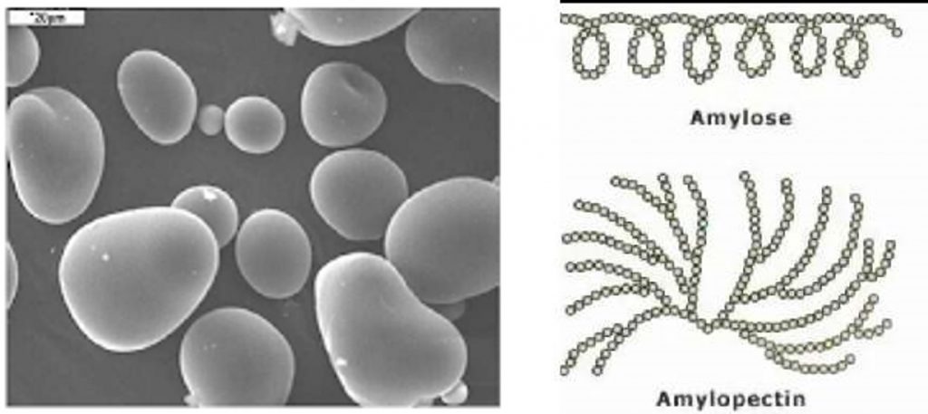 En résumé, l’amidon se présente sous forme de grains dans les végétaux. C’est un sucre complexe (polysaccharide) composé de chaines de sucres simple (glucose) sous 2 formes: l’amylose (chaine linéaire) et l’amylopectine (ramifiée comme un arbre).