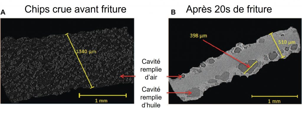 Comme nous l’avons vu dans des articles précédents sur les frites fines et croustillantes ou les chips, le croustillant correspond à une croûte sèche d’amidon qui contient beaucoup de cavités remplies d’air et d’huile.