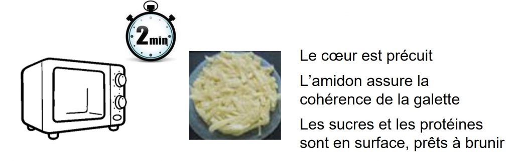 - Le « secret » de cette recette, c’est de précuire les galettes 2 minutes au micro-ondes : ça précuit l’intérieur, tient les morceaux râpés entre eux, et permet une coloration plus rapide pour conserver un intérieur moelleux.