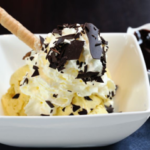 Un dessert simple mais tellement bon ! Une boule de glace vanille sur laquelle on verse une délicieuse sauce chaude au chocolat, et quelques amandes effilées et torréfiées au micro-ondes pour apporter du croustillant.
